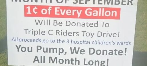 For every gallon of gas you buy, one cent will be donated to the Triple C Riders toy drive.